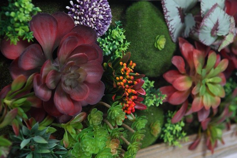 Decorativo y artístico mini jardin vertical, con combinacion de musgo y especies tropicales y plantas crasas Marco de madera envejecida para contrastar con tus muebles mas minimalistas